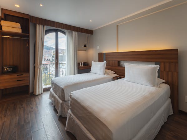 The twin room provides a wardrobe, a safe deposit box, parquet floors, a flat-screen TV, as well as a superb view over the Sucre square and the most iconic jail of Southamerica "San Pedro" as well as small space for relaxing with a sofa bed